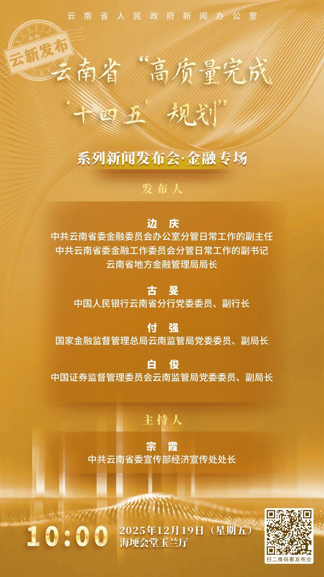 12月19日上午,云南省人民政府新闻办公室在云南海埂会堂举行云南省“高质量完成‘十四五’规划”系列新闻发布会·金融专场,介绍有关工作情况并回答记者提问。