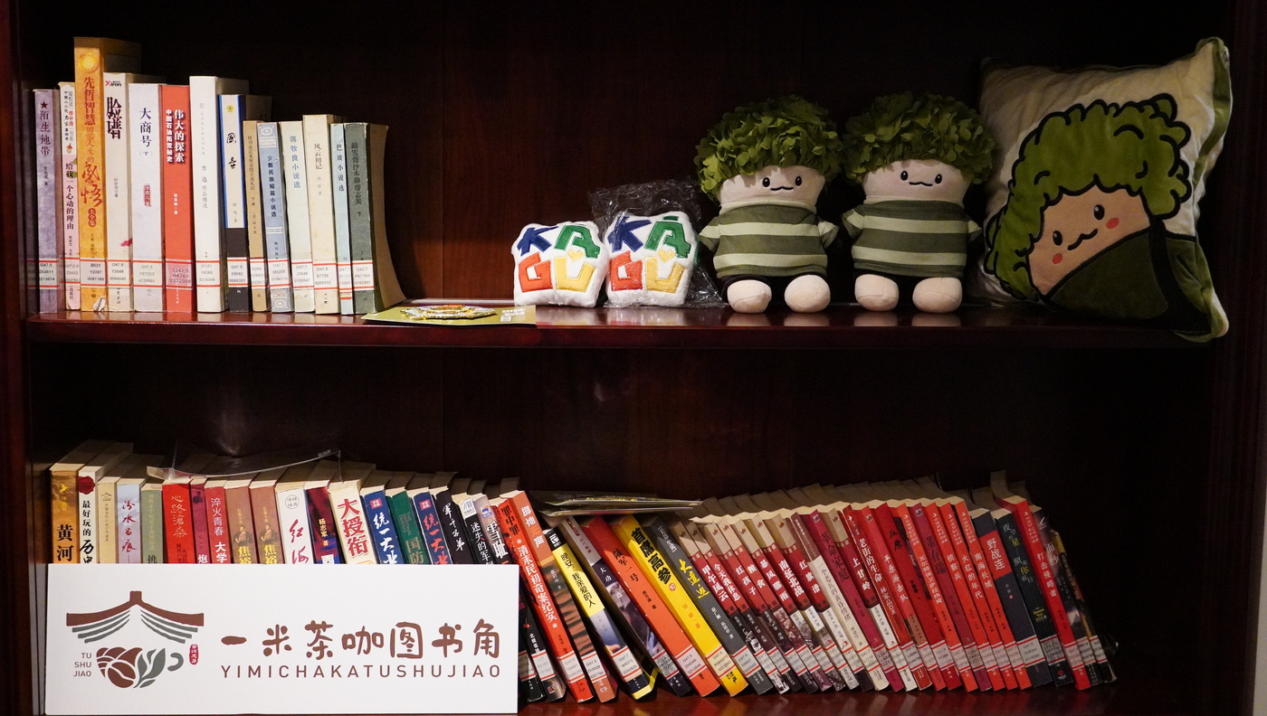四川游客李萍和朋友在一米茶咖图书角挑选书籍。