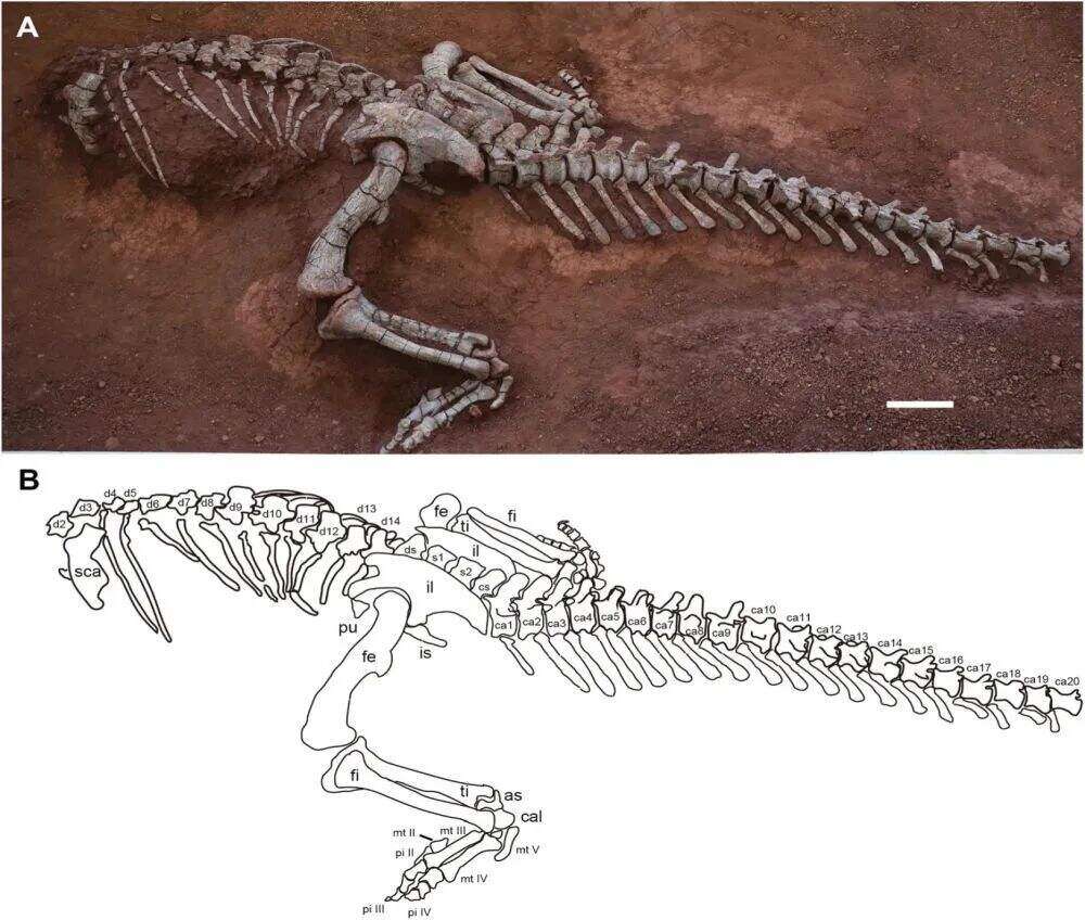 岳氏星宿龙骨骼化石及素描图。(中国科学院古脊椎动物与古人类研究所供图)