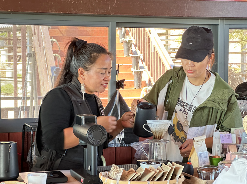 游客在咖啡庄园体验咖啡冲泡。李清清 摄