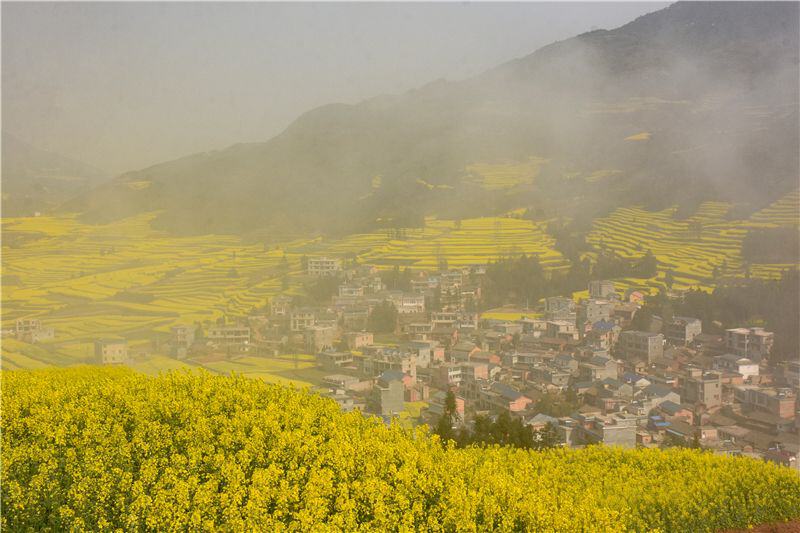 金鸡峰丛晨雾缭绕,螺丝田曲线灵动,风过处花浪翻滚,花香沁脾。漫步花田,看蜂飞蝶舞,吃一碗花米饭,把春日浪漫尽数收藏。