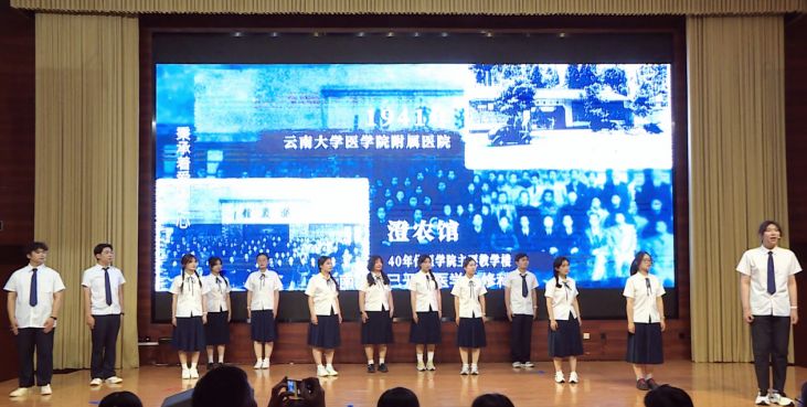 为丰富晚会表现形式,活动还特邀校内音乐社与校艺术团参与演出。窄门乐队带来的《生活因你而火热》以激昂的旋律点燃全场,传递出昂扬向上的青春风貌;民族舞《火塘欢歌》以优美舞姿展现了民族团结的动人画卷,将铸牢中华民族共同体意识的主题融入艺术审美。全场齐声合唱的《云南大学校歌》,嘹亮歌声中洋溢着云大医学人的自豪;诗朗诵《我的祖国 我的云大》则将现场气氛推向高潮,深情抒发了学子对祖国的热爱、对母校的眷恋以及对未来的坚定信心,使家国情怀与医者初心深深植根于心灵深处。