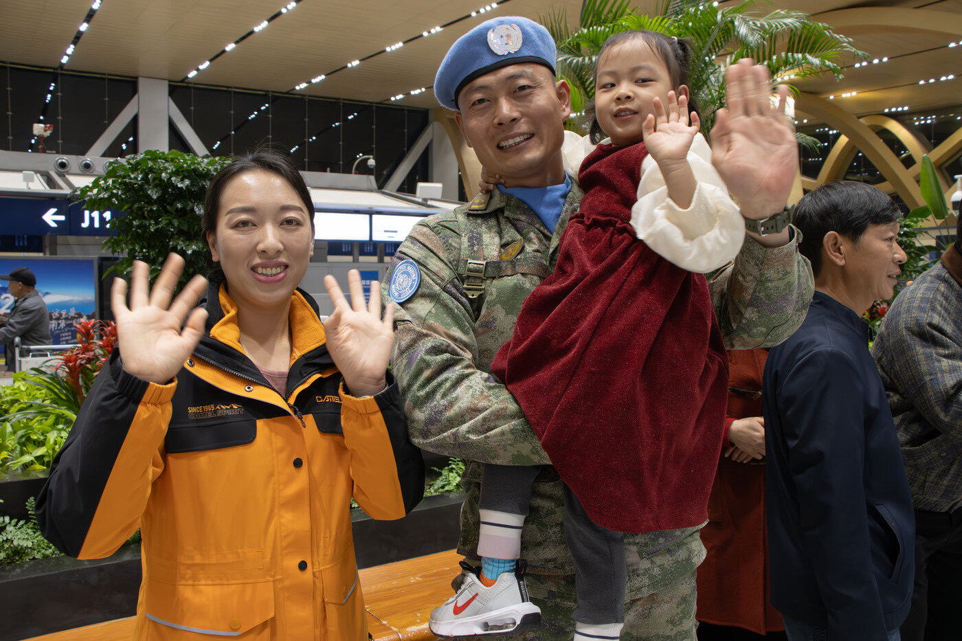 11日凌晨的昆明长水机场,维和官兵头戴标志性蓝色贝雷帽,肩挎统一突击背包,背包外侧,都插着一面中国国旗,这一抹红色在迷彩绿的映衬下格外醒目,一张张年轻而坚毅的面庞,眼神专注有力。机场大厅内,维和官兵与前来送行的战友、家属进行简短告别。