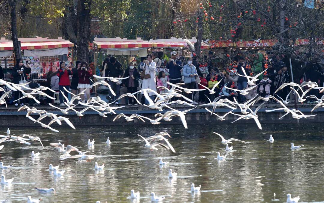 游客在翠湖公园喂红嘴鸥。黄晓松 摄