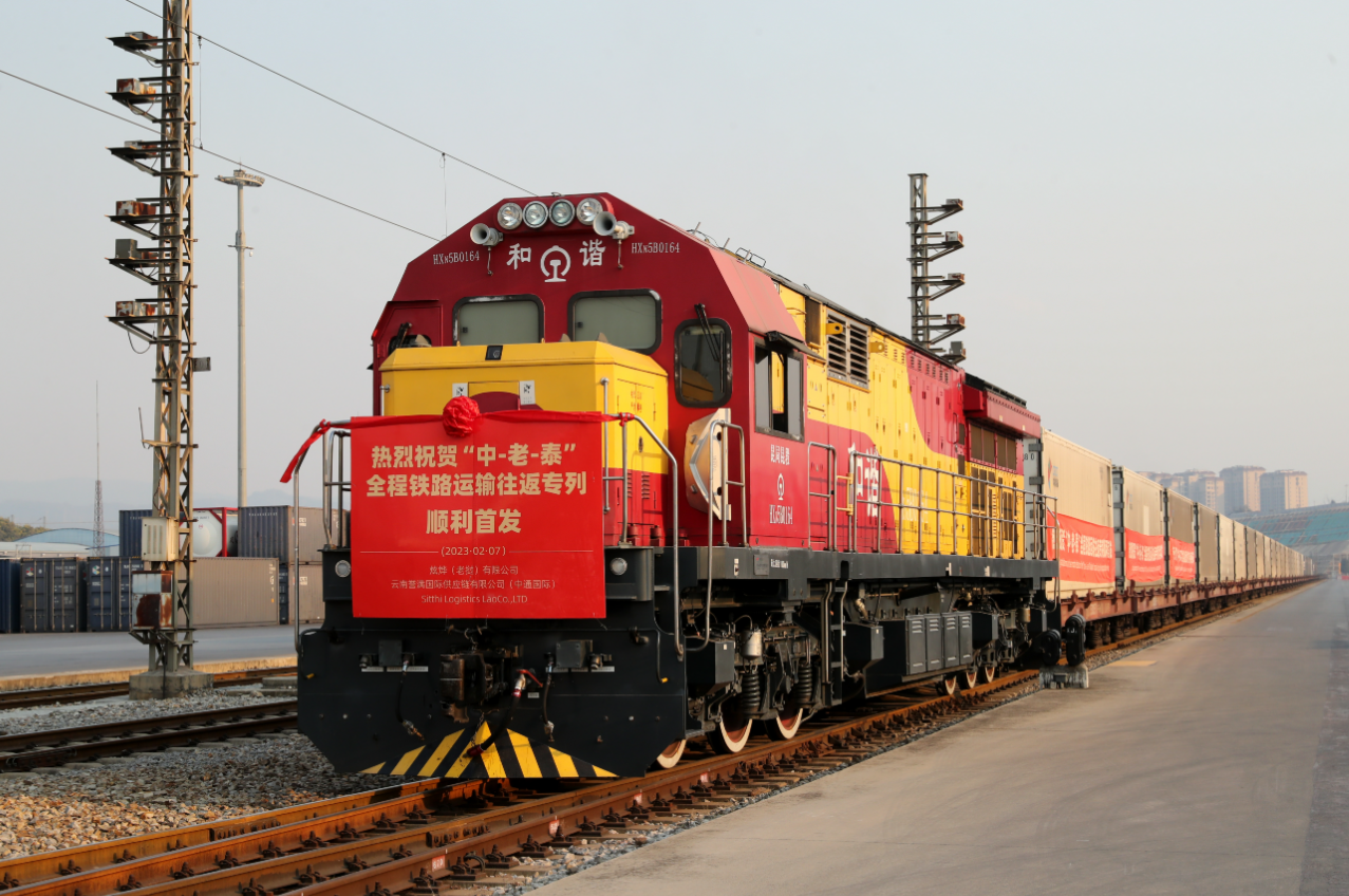 2023年2月7日,“中-老-泰”全程铁路运输往返班列在昆明中铁联集王家营西集装箱中心站首发。杨峥 摄