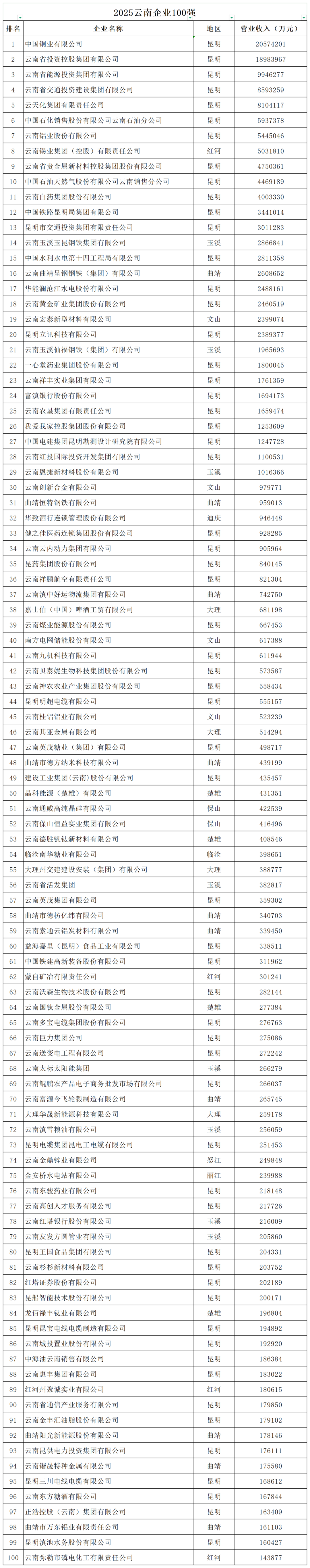 这是云南省企业联合会、云南省企业家协会第18次向社会公开发布云南企业100强名单,同时发布《2025云南企业100强研究分析报告》。名单的发布严格参照国际通行法则及中国企业500强排序标准,以企业2024年度营业收入为核心指标,遵循企业自愿申报原则,经过严谨的数据采集、审核与核算,最终形成覆盖多领域、多层次的系列名单,是云南企业发展成就的一次集中展示。