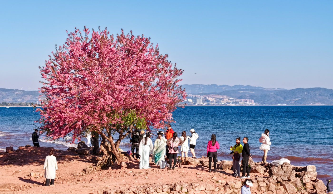 抚仙湖红沙滩景区冬樱花悄然盛放,吸引市民游客游玩。