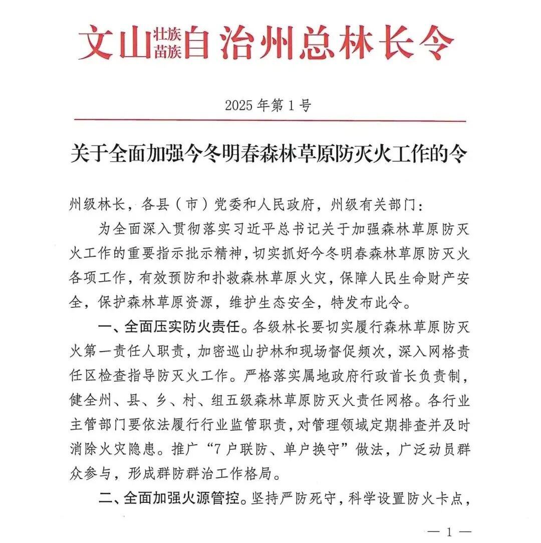 近日,文山壮族苗族自治州双总林长签发关于全面加强今冬明春森林草原防灭火工作的令,要求各州级林长,各县(市)党委和人民政府,州级有关部门要全面压实防火责任、全面加强火源管控、全面排查消除隐患、全面强化指挥体系、全面开展宣传引导、全面实行追究问责。