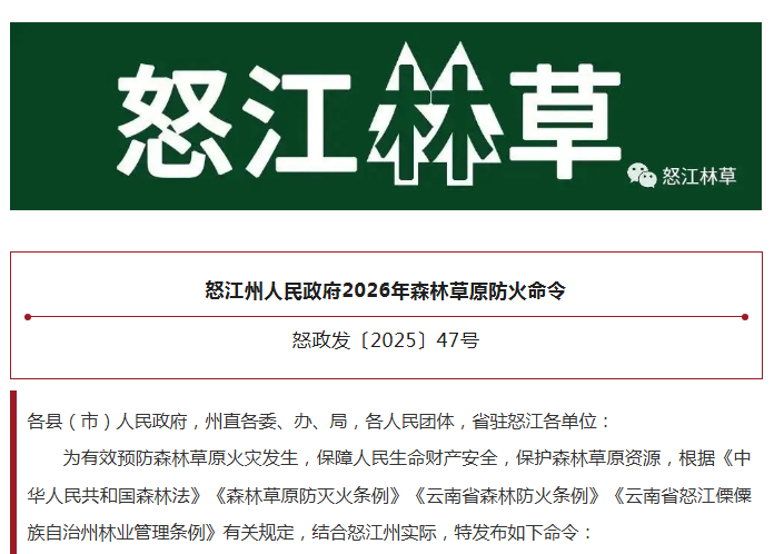 近日,怒江傈僳族自治州人民政府发布2026年森林草原防火命令,明确防火期、高火险期和防火区,要求各县(市)人民政府,各级有关部门要落实防火责任、严格管控野外火源、加强防火宣传教育、做好应急值守。任何单位和个人发现森林草原火情,应立即拨打森林草原火警电话12119报警。