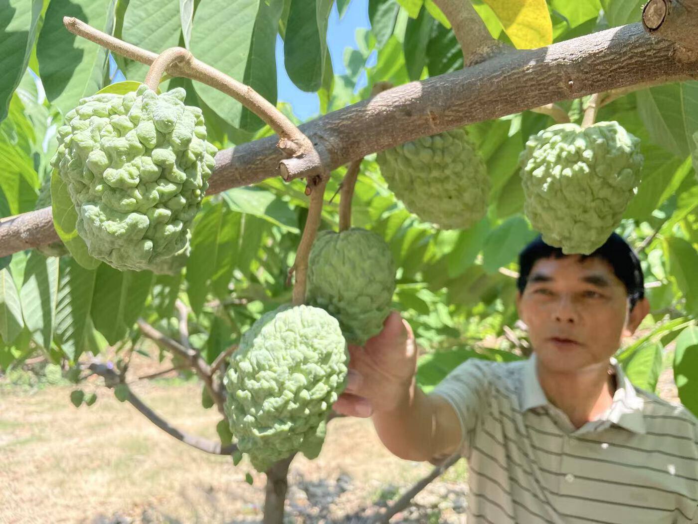 在元江县澧江街道的山坡上,千余亩番荔枝树正在结出累累果实。因其特别的外壳形状,番荔枝又名“释迦果”,果肉口感绵密香甜,被称为“长在树上的冰激凌”。