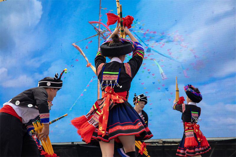 节日期间,苗族同胞会穿上盛装,吹起芦笙跳起舞,对着山歌,举行斗鸡、斗牛、爬花杆、打陀螺、打弹弓等比赛,共同庆祝节日的到来。