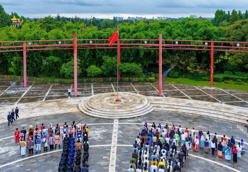 升旗仪式后,云南民族村团结广场上响起阵阵清脆的民族歌声,来自云南26个民族的兄弟姐妹与广大游客一起载歌载舞,各族儿女用歌声传递祝福,用舞蹈表达喜悦,共同庆祝祖国的生日。