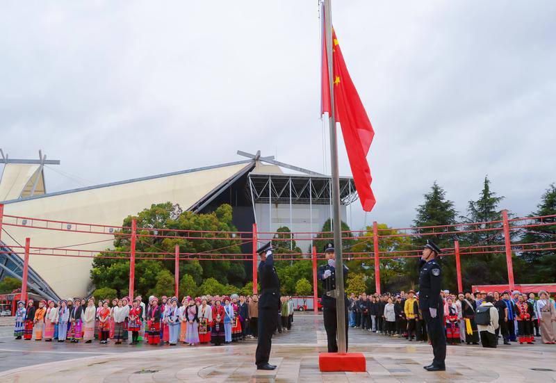 在雄壮的国歌声中,五星红旗冉冉升起,各族群众齐声高唱国歌,歌声激昂嘹亮,饱含着对祖国的深情厚谊和美好祝愿。