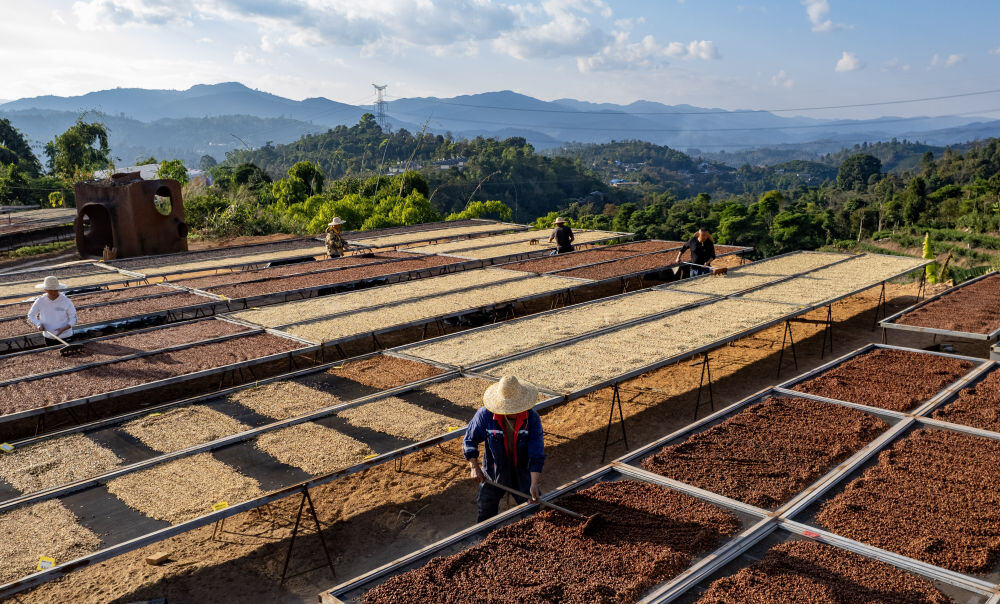 2025年1月7日,工人在普洱市思茅区一家咖啡庄园翻晒咖啡(无人机照片)。