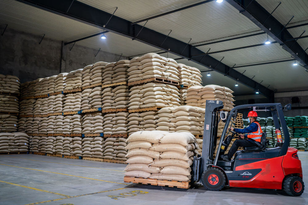 20世纪90年代起至今,普洱陆续成为雀巢、星巴克等咖啡跨国企业在中国的主要原料产区,产品不断销往荷兰、意大利、德国、菲律宾、韩国等国家和地区,为云南咖啡赢得了国际认可度。这是工作人员在普洱雀巢咖啡中心搬运咖啡生豆(2025年1月8日摄)。