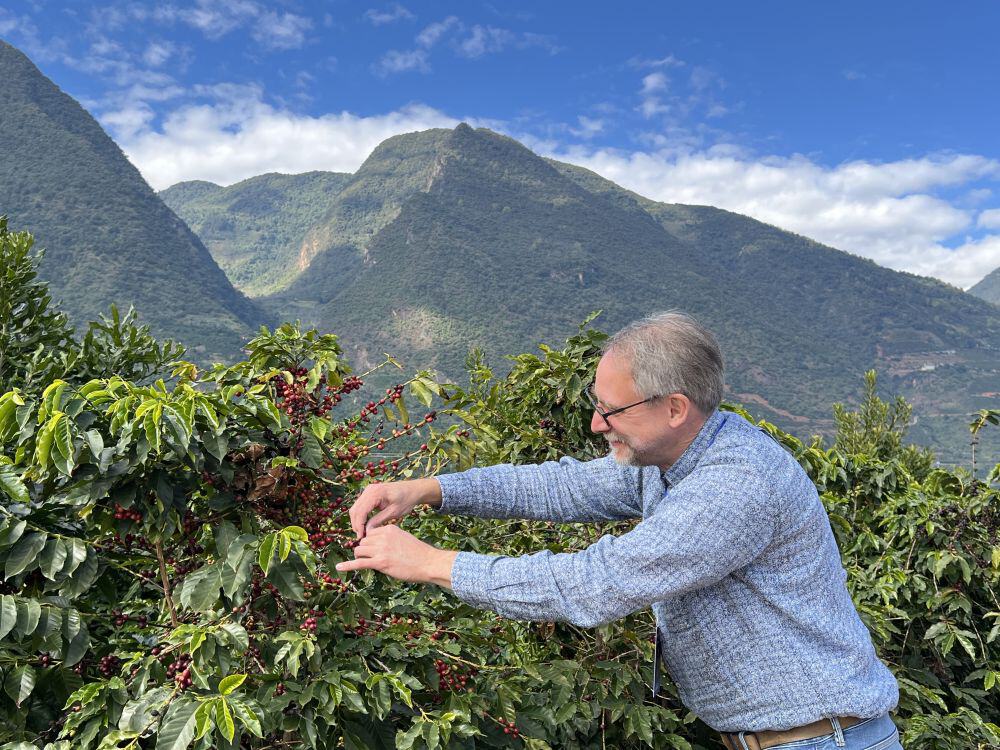 2024年12月5日,德国咖啡企业家埃里克·巴登在保山市隆阳区潞江镇新寨村咖啡种植基地体验咖啡鲜果采摘。