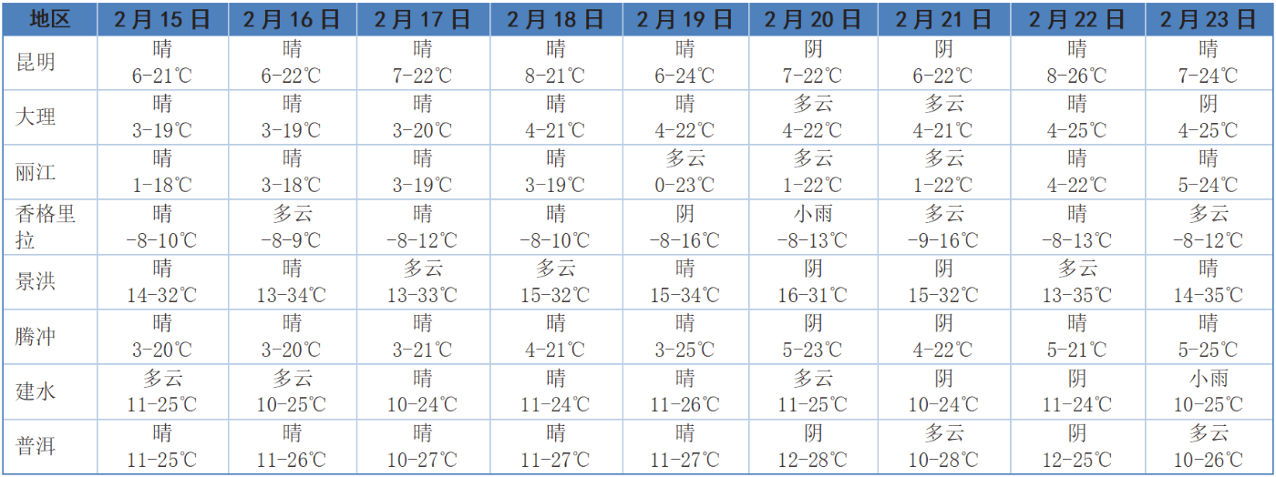 春节假期云南部分城市天气预报