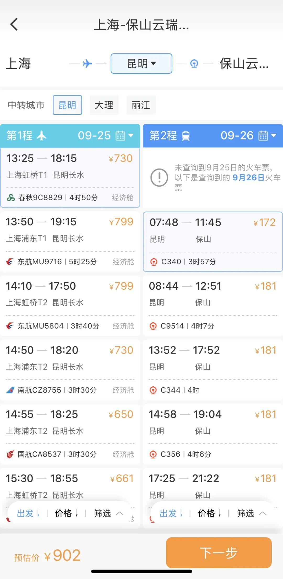 选择合适航班下单支付