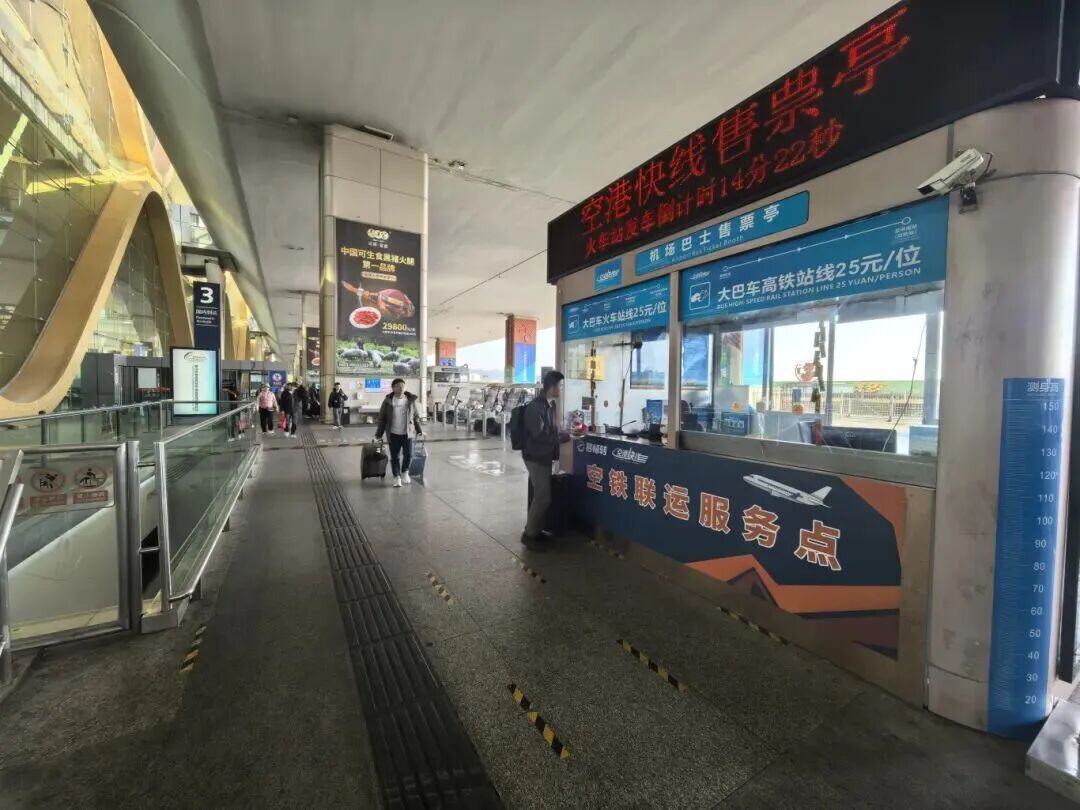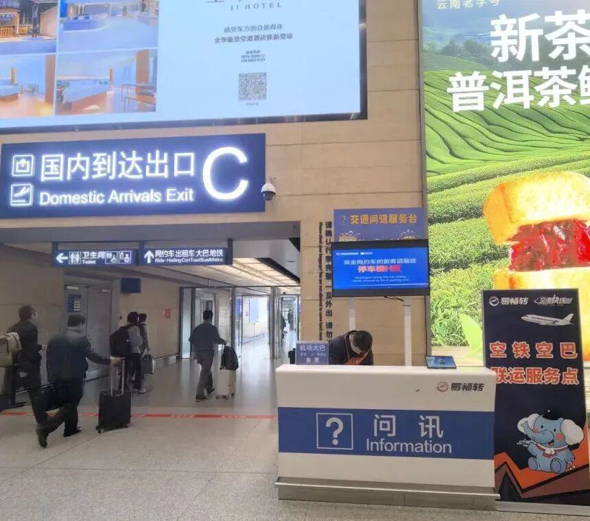 在昆明机场A、C到达出口处各设置一个空铁联运、空巴联运换乘咨询柜台,选择线路后核实身份并付款,便可一站式购票。
