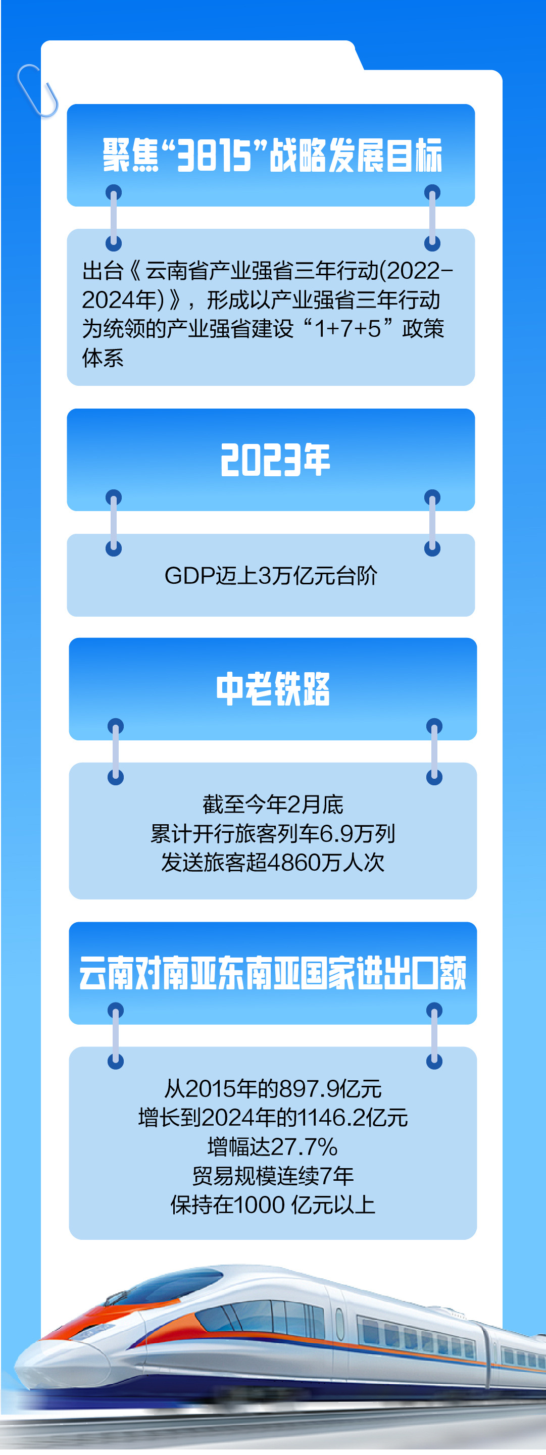 春风化雨,山河明丽。GDP在2023年迈上3万亿元台阶、中老铁路从“通”到“旺”、过去3年全省农民收入年均增长7.1%,远高于经济增速……新时代新征程上,云南各族干部群众团结一心,奋楫前行。