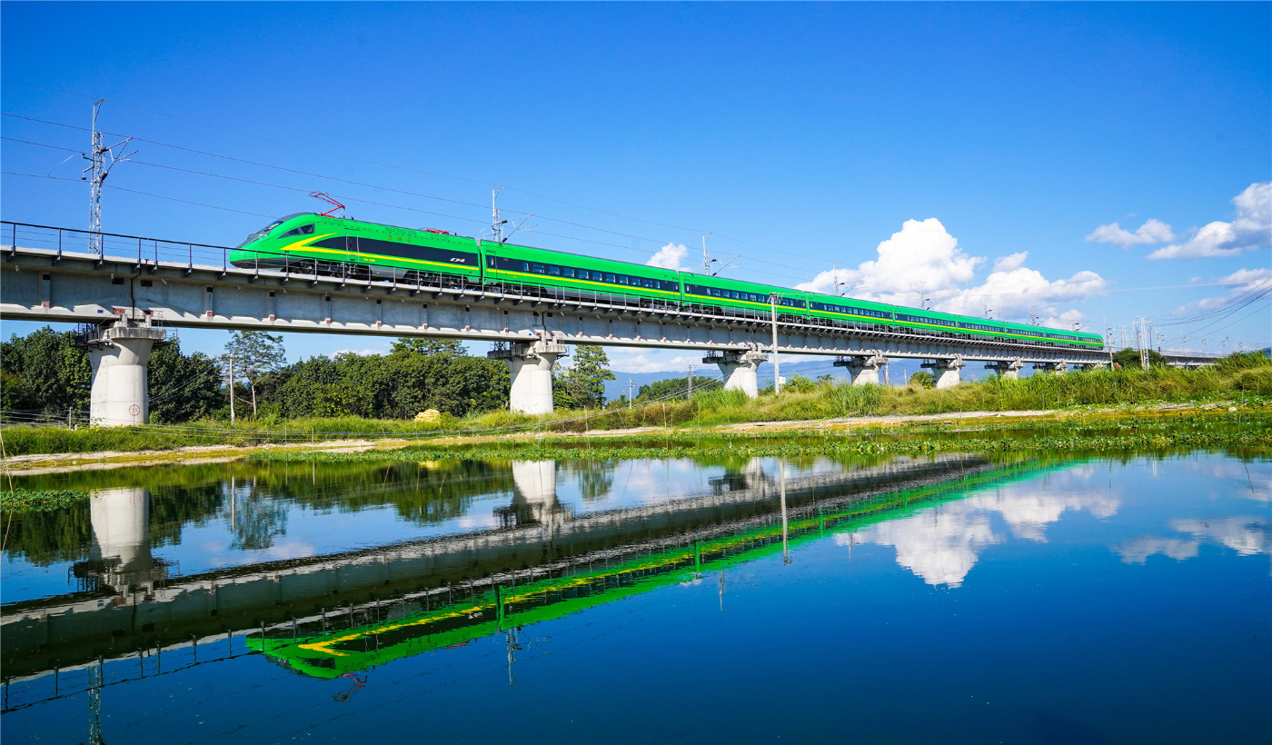 复兴号动车组飞驰在中老铁路橄榄坝特大桥上。杨林 摄