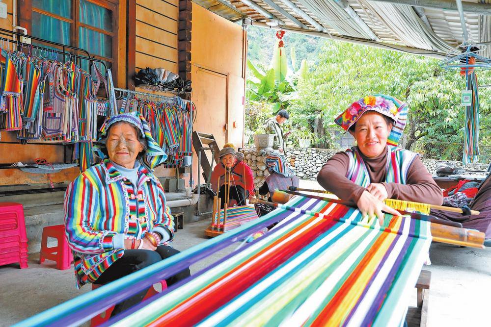 李玉花(右)在庭院里编织独龙毯。