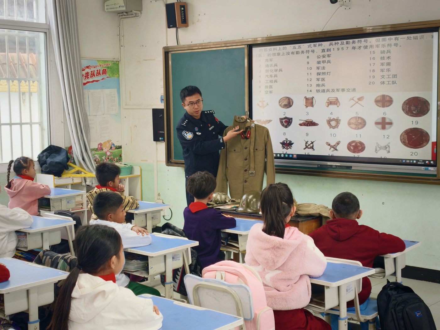 课堂从一套雷锋入伍时期配发的“五八式”军装开始。民警手指抚过领口的红领章,向孩子们讲述“一件军装,一生使命”的雷锋故事。当黑白老照片、彩色影像与卡通版雷锋形象同屏呈现,一场跨越时空的对话悄然展开,雷锋形象从书本走入现实,忠诚与奉献的精神内核吸引着孩子们清澈而专注的目光。