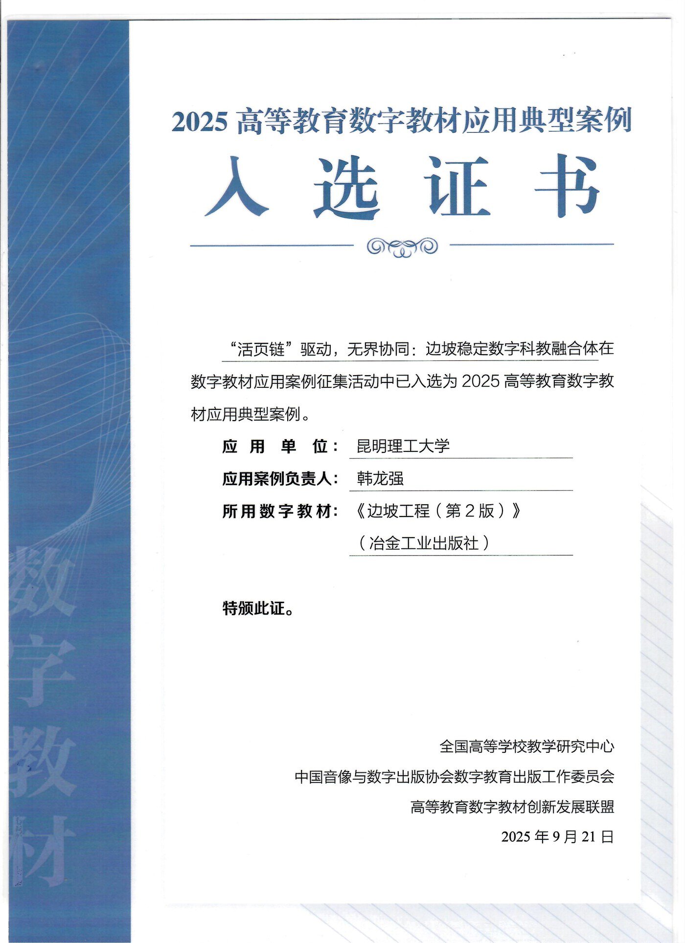 9月21日,“高等教育数字教材创新发展生态大会”在杭州召开。大会为“2025年高等教育数字教材应用典型案例”颁发了证书,由国家级“重大人才工程”特聘教授、昆明理工大学二级教授吴顺川领衔团队编写的《边坡工程》和《岩石力学物理试验和数值试验》从200余个参评项目中脱颖而出,成功入选。本年度应用案例评选云南省仅入选2部教材,均来自吴顺川教授团队,实现云南省高等教育数字教材建设新突破。