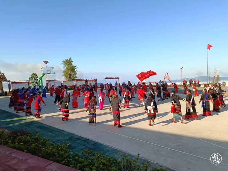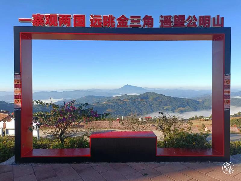 站在勐董镇永和社区国门新村佤文化活动广场上,“身在幸福村,一寨观两国,遥望公明山”的标语十分引人注目。在宽敞的佤文化广场上,既可观赏美丽的国门新村佤族民居全景,又可远眺缅甸掸邦第二特区(佤邦)勐冒县公明山异国风情,“开放前沿、秘境边关”的边关风情特色十分鲜明。