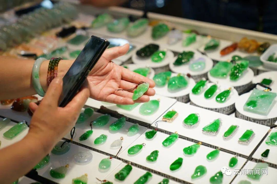 各色翡翠玉石在灯光下泛着温润的水光