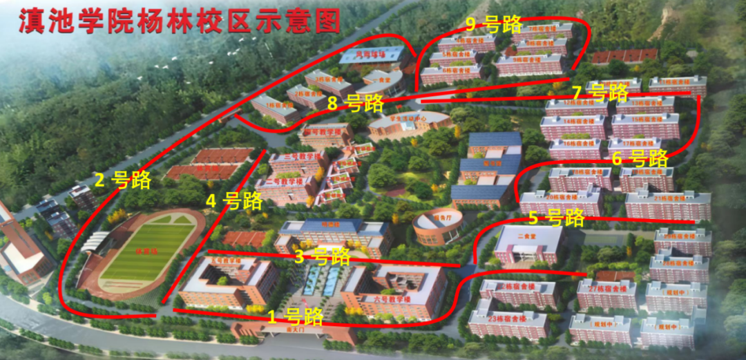 杨林校区主干道:包括教学区、生活区主要道路。(具体主干道路线划分见附件:杨林校区主干道及主要建筑命名征集示意图。)