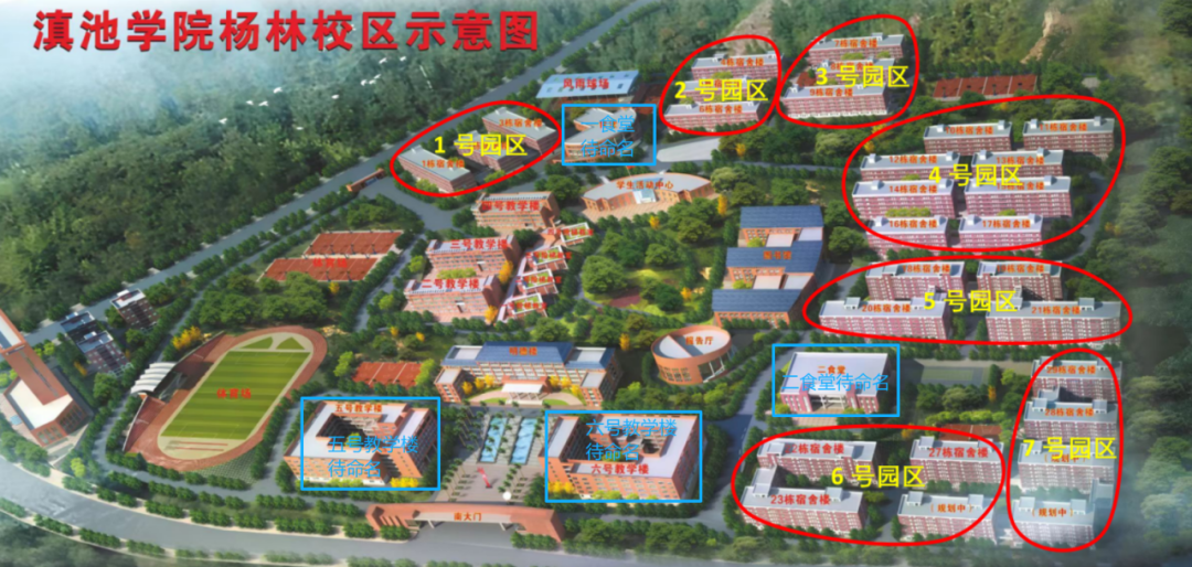 杨林校区主要建筑:包括未命名教学楼、食堂及各学生公寓楼栋园区。(具体命名建筑及园区划分见附件:杨林校区主干道及主要建筑命名征集示意图。)