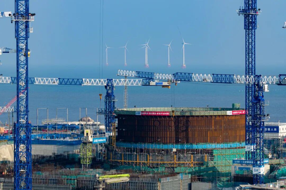 12月15日,浙江宁波象山县金七门核电项目建设现场,机械轰鸣,施工人员有序作业。章勇涛摄