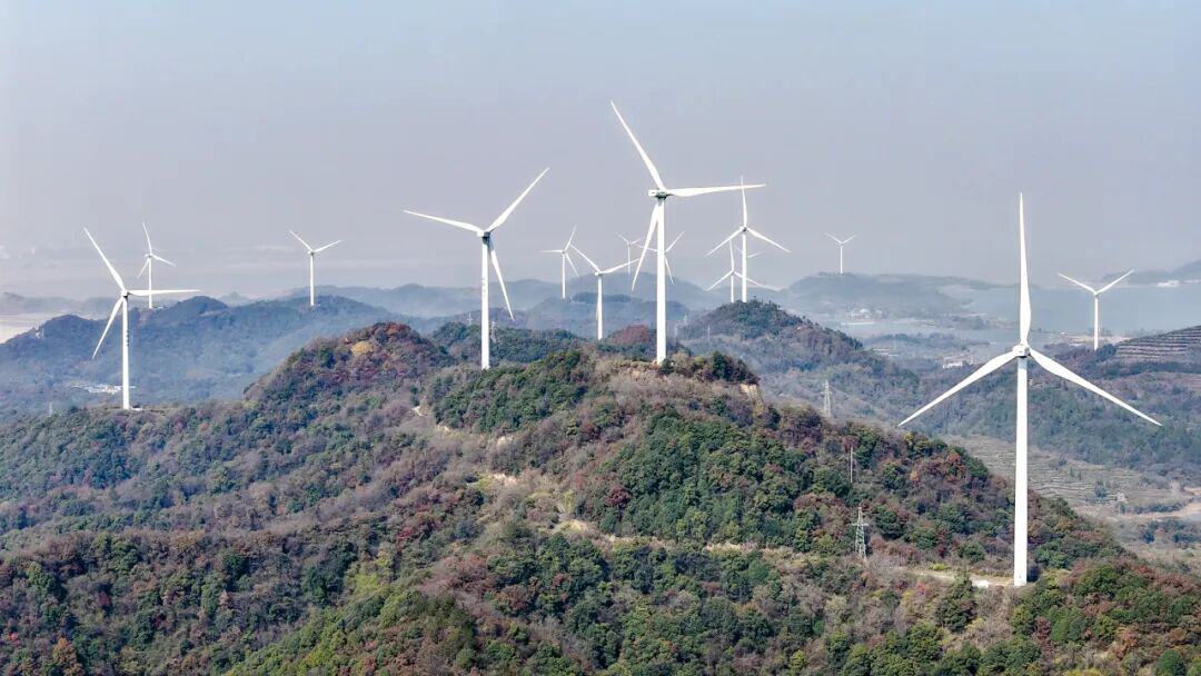 12月3日,在江西九江市湖口县舜德乡高桥村,风力发电机组矗立青山间,不断输送绿色清洁能源。张玉摄