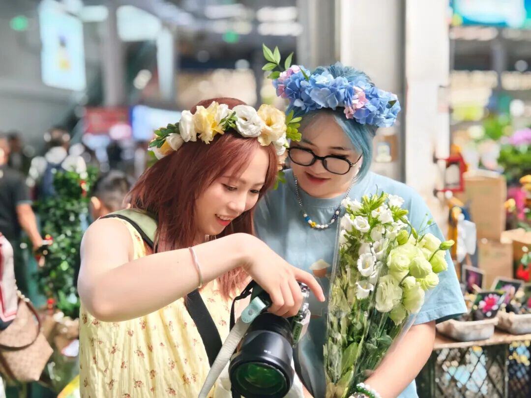 游客在斗南花卉市场打卡拍照。