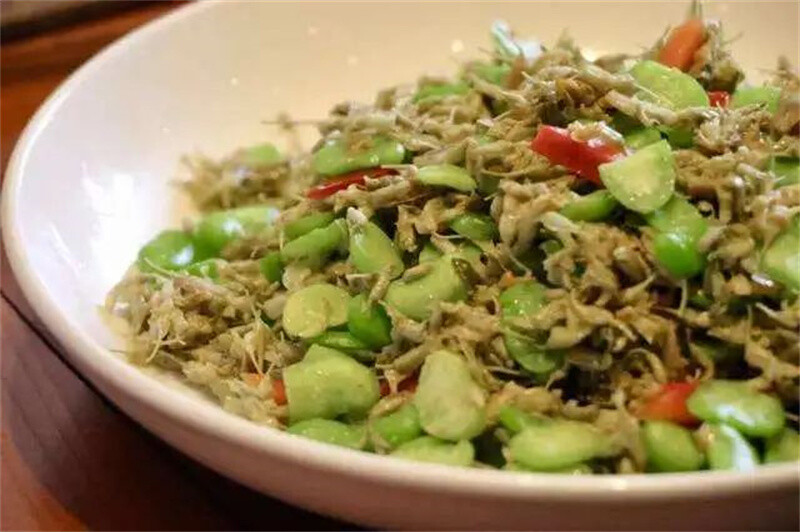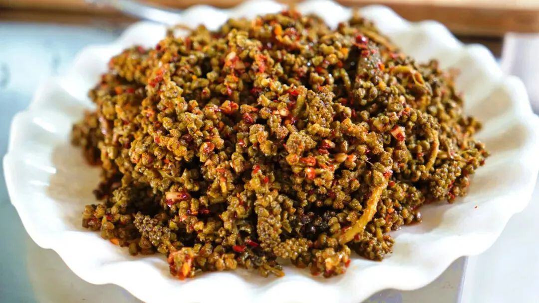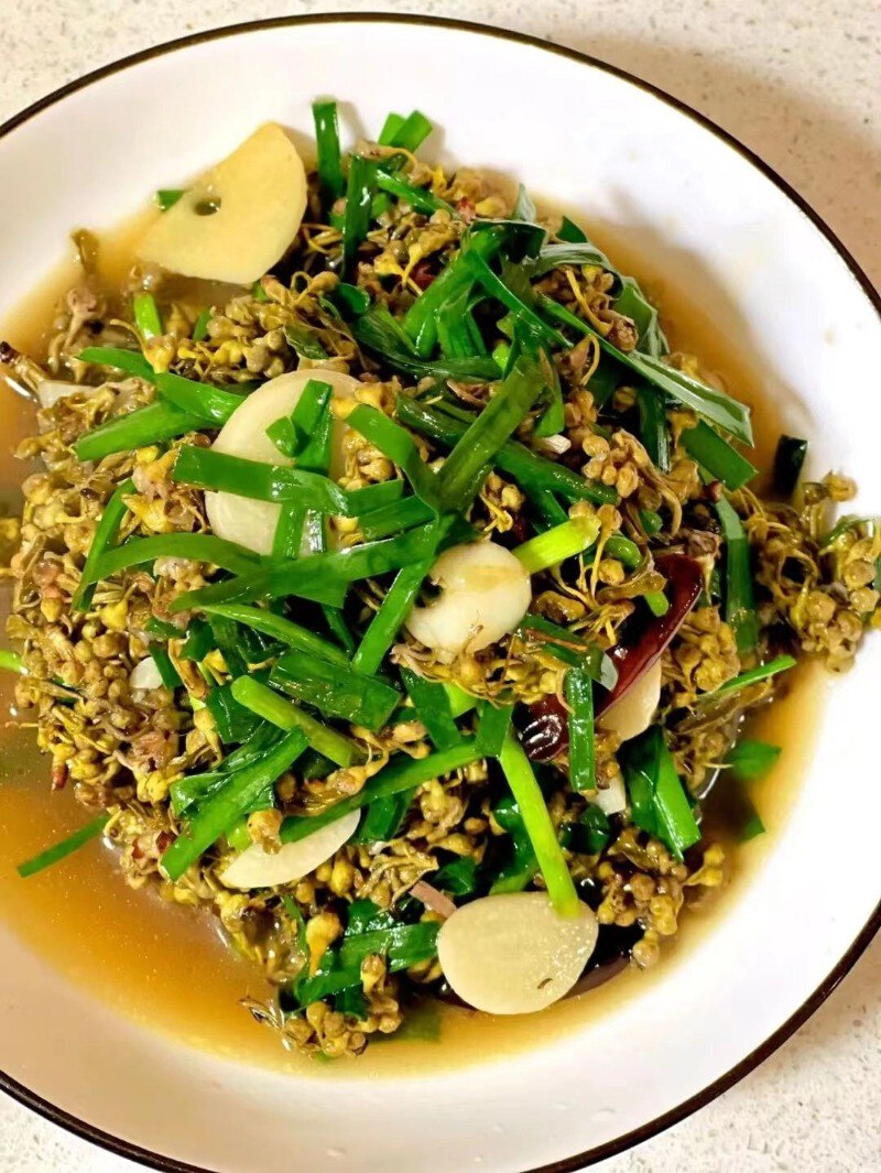 马桑花:马桑花时令很短,只有不到两个月的花期,所以想吃一定要赶时间。一串串绿色的马桑花,在花穗没有绽开前是最鲜嫩的,连着花穗边上的嫩叶、嫩尖一起采摘后,用清水漂洗干净,可以清炒、炒肉、煎鸡蛋、炒豆腐,淡淡的花香里带着一点回甜,美味无比。