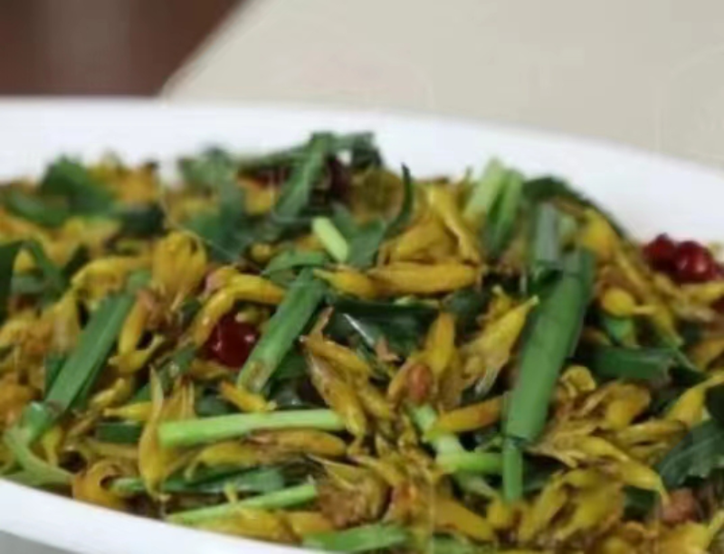 石榴花:取下红石榴花的肥大花瓣部分,精心处理后,常与腊肉、韭菜同炒,色泽鲜艳,口感爽脆,是许多外地食客意想不到的美味。
