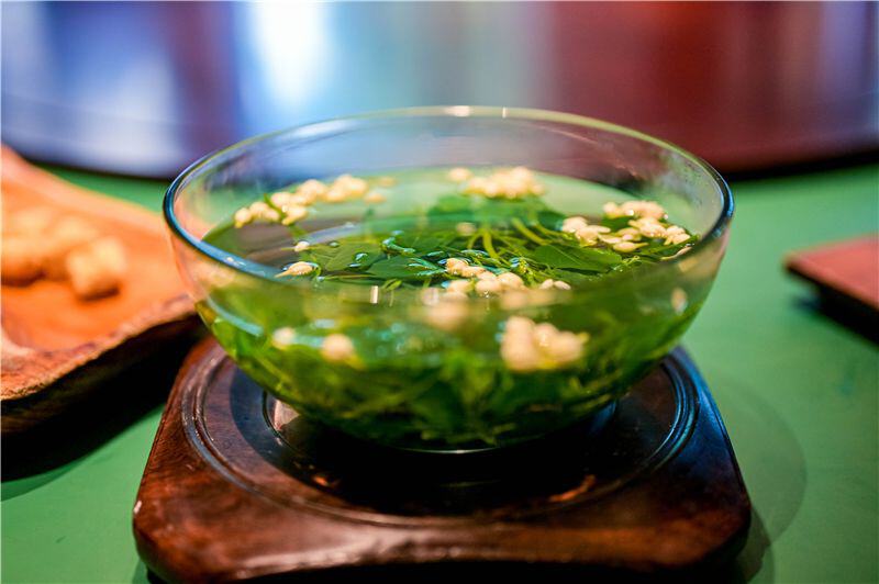 茉莉花:洁白的茉莉花与粉嫩的虾仁相映成趣,花香淡雅,虾仁清甜,恰似一首味觉上的春之曲,是春日宴席上的雅致之选。山泉水与清香的茉莉花、甜菜煮一锅,便成了春日里一道清润养人的甘甜茶汤。