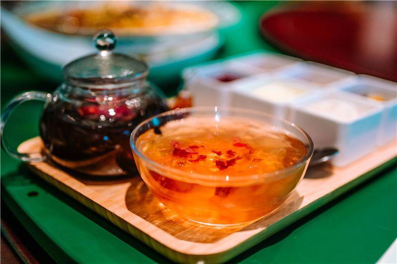 玫瑰糖则将春天封存。新鲜采摘的食用玫瑰与红糖、蜂蜜一同发酵,时间赋予了它醇厚的香气和深红的色泽,成为可以品味一整年的春天记忆。除了著名的玫瑰花酿,还有桂花泡酒、桃花酿、酸角花蜂蜜水等,从视觉到味觉都春意盎然。