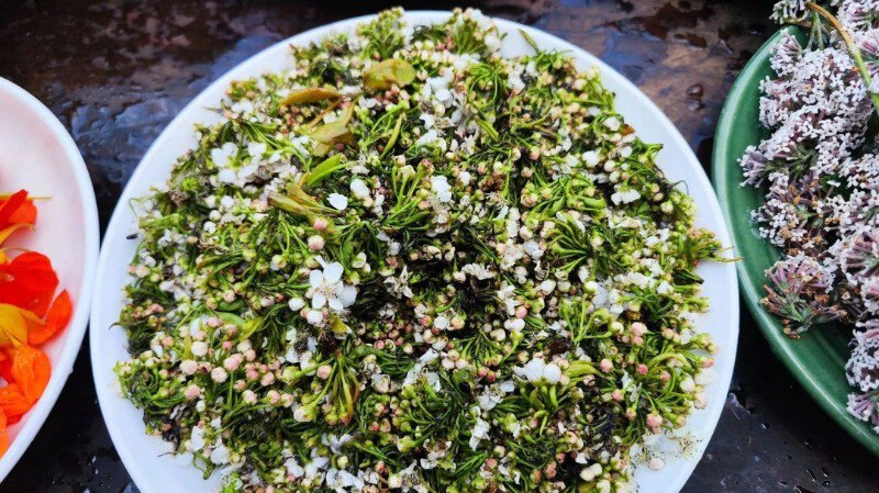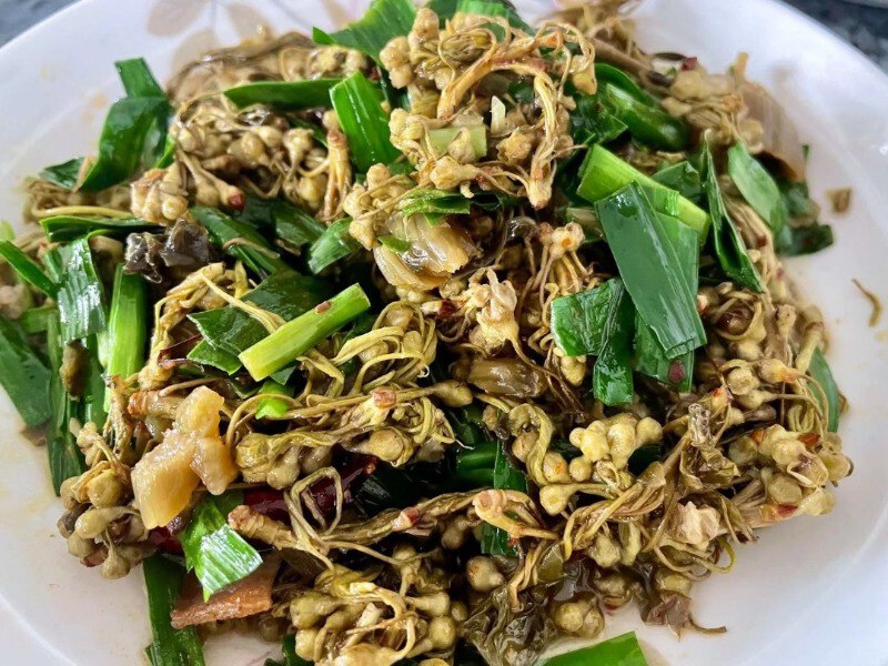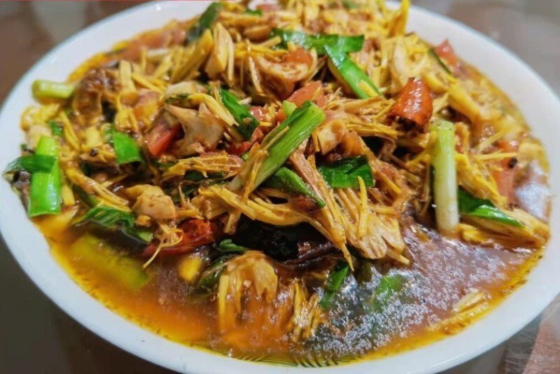 树花寄生于老木之上,晒后发水、焯熟,与田埂上新采的鱼腥草同拌,佐以酱油、醋、小米辣、花生碎,凉拌而成。酸辣鲜香,层次丰富,是一道极具山野气息的佐餐小菜。