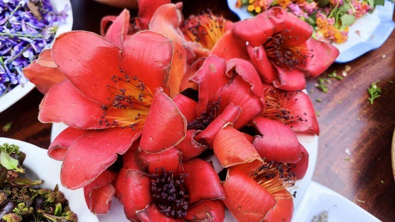 攀枝花如火般热烈,不仅夺目,更撩人味蕾。食其花蕊,需经焯水、浸泡、撕条,再与干辣椒、蒜、韭菜、番茄同炒,酸甜适口,滑嫩爽脆,别具一格。每一口,都是春风与阳光的馈赠。