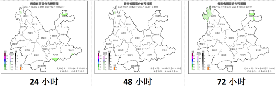 2月2日20时至2月3日20时:迪庆州北部高海拔地区多云有小雪或雨夹雪,昭通市北部、曲靖市东部、文山州、红河州南部阴天间多云局部有小雨,其他地区多云间晴。