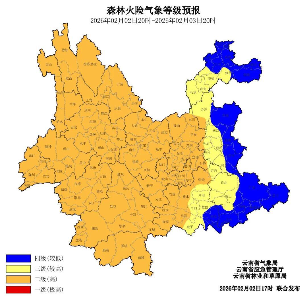 2月2日20时至2月3日20时,怒江州、迪庆州、丽江市、大理州、保山市、德宏州、临沧市、普洱市、西双版纳州、楚雄州、昆明市、玉溪市、红河州西部二级,昭通市南部、曲靖市西部、红河州东部和文山州西北部三级,其他地区四级。