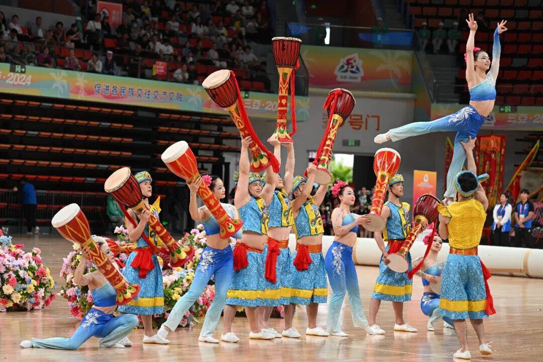 第十二届全国少数民族传统体育运动会上,云南省代表团的表演项目《跃动鼓韵》获得技巧类一等奖。王波/摄