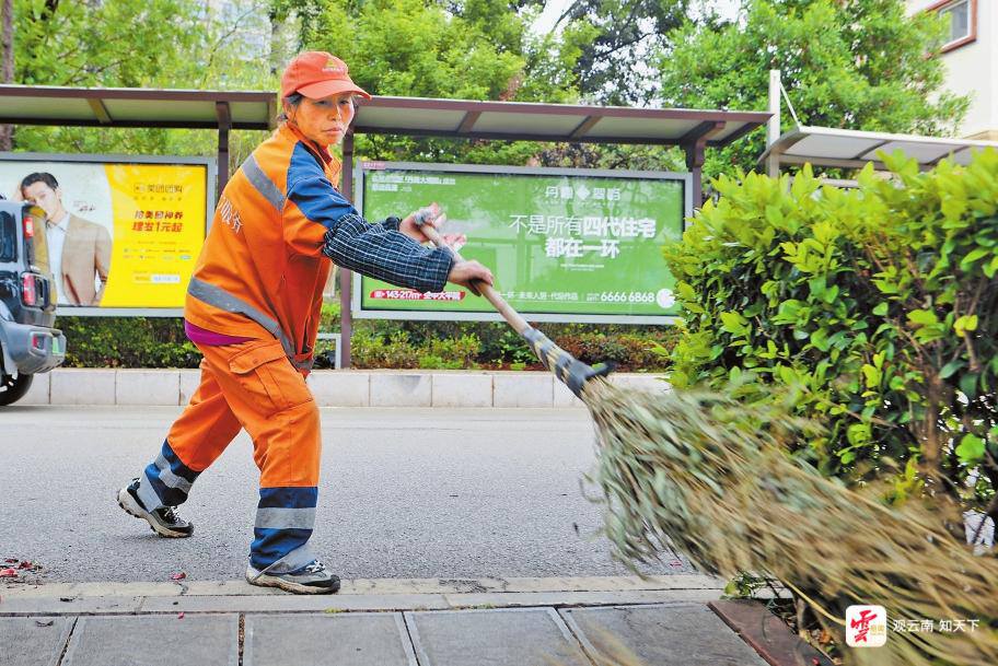 环卫工人在昆明望江路附近街区进行城市保洁工作。