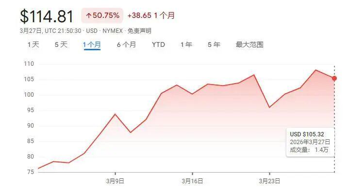 △截至3月27日(周五)收盘,2026年5月交割的布伦特原油期货价格在一个月内涨幅超过50%,达到每桶114.81美元。