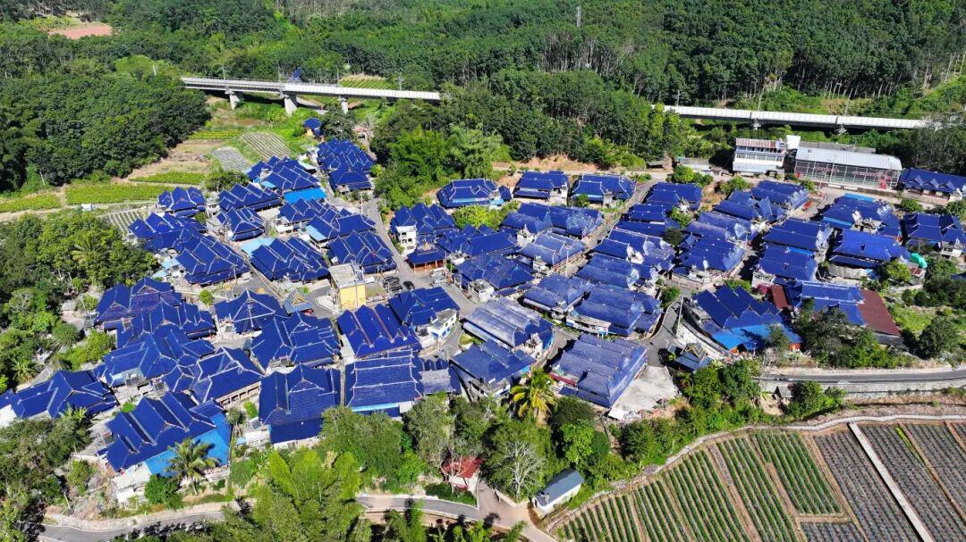 在曼庄村大龙哈村小组,屋顶覆着深蓝色琉璃瓦的干栏式建筑,傣家风情浓郁。