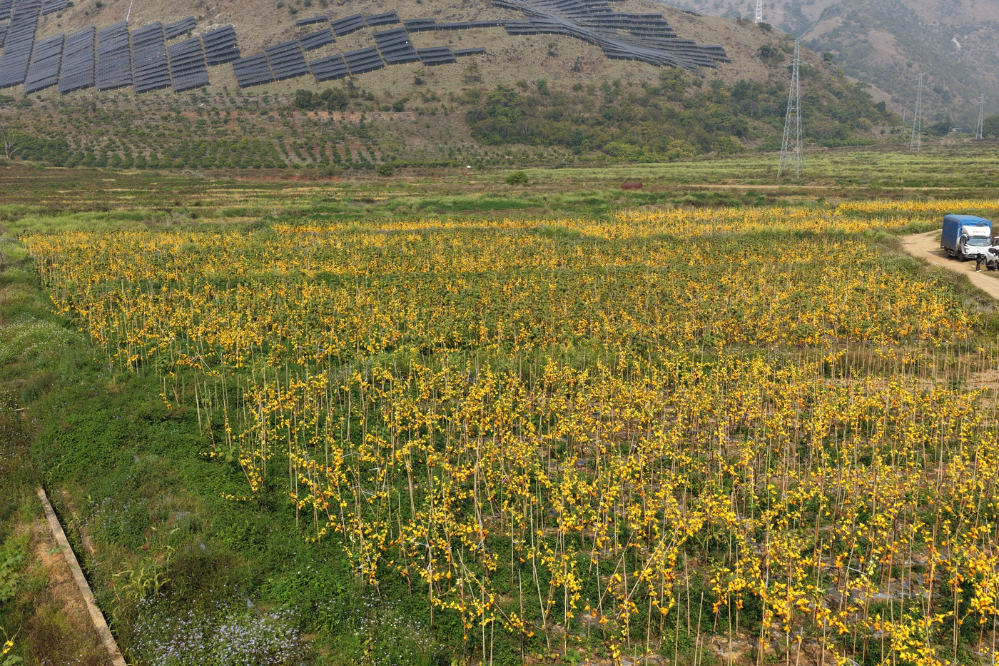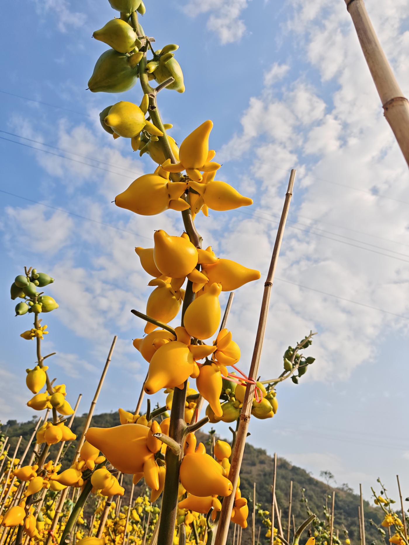 在干坝社区,百亩乳茄基地绵延成片,织就一望无际的金色原野,成熟的果实在阳光的照耀下愈显温润饱满。社区居委委员廖彦景介绍:“乳茄是近一年来新增的花卉品种,2025年夏天种植,当年冬季就能采收,为冬季花卉市场增添了新的选择。”