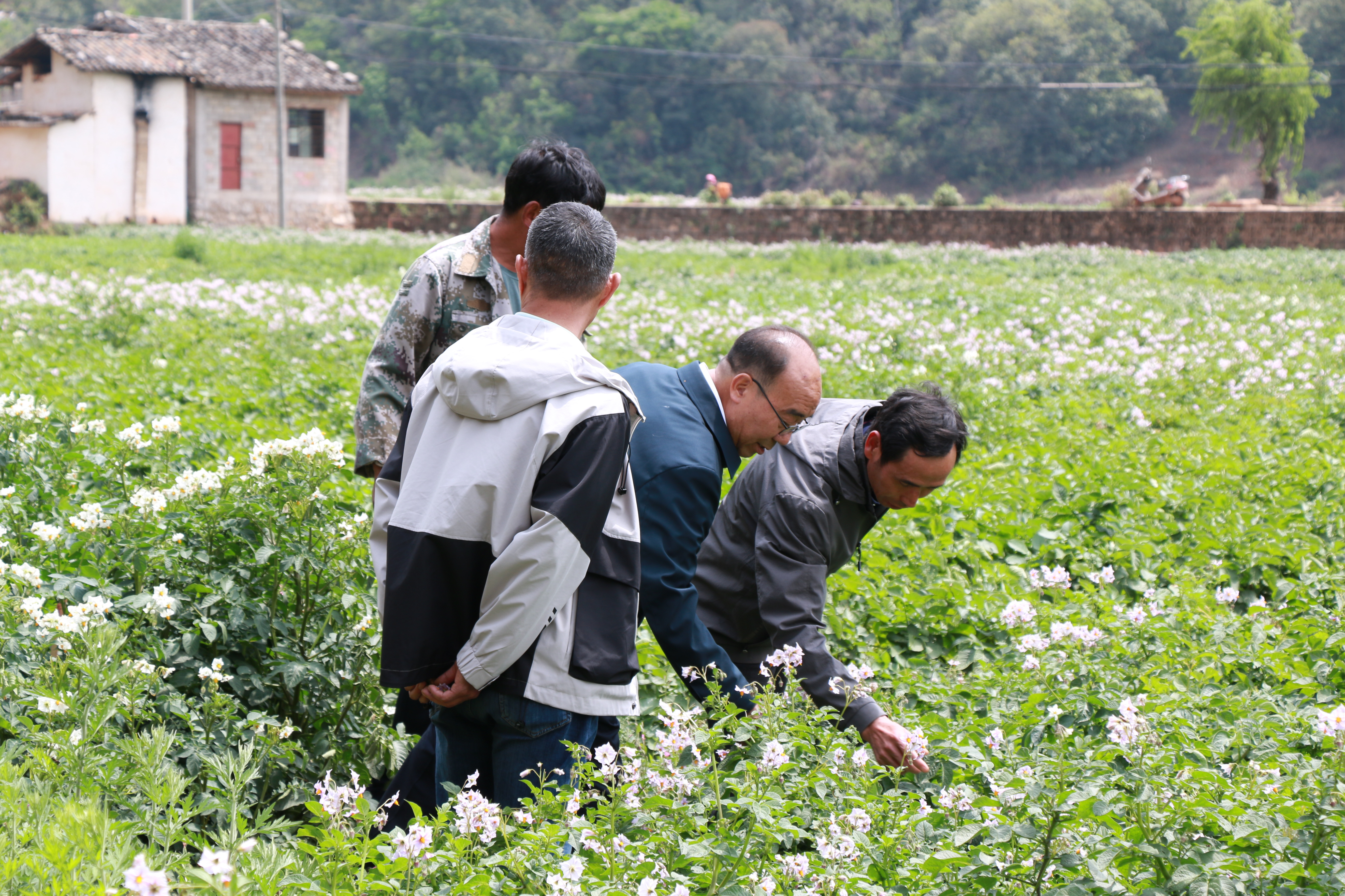 凤合镇朱家湾村的马铃薯地里,全国劳动模范、云南泵龙马铃薯种植有限公司董事长胡荣海蹲在地头,手里托起一株马铃薯苗,向围拢的农户讲解脱毒种薯的优势。