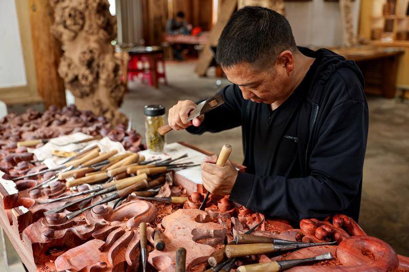 剑川县甸南镇的天艺园木雕博物馆里,木匠师傅正在雕刻木雕工艺品。
